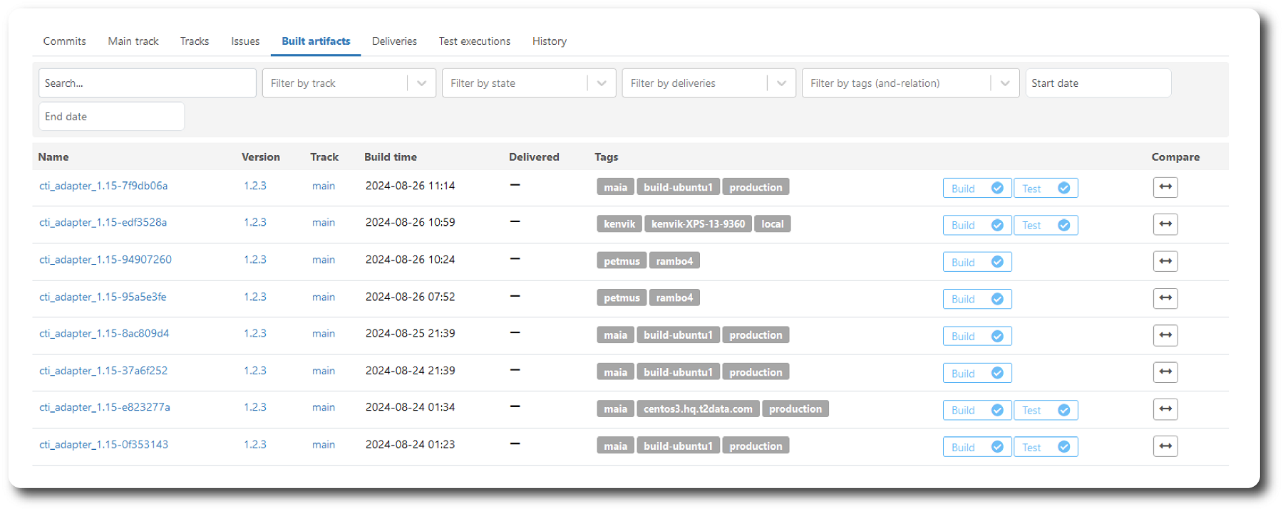 The built artifacts table displays all builds the current team has permission to see. If the user performs a search (filter), the table displays the results from the search.