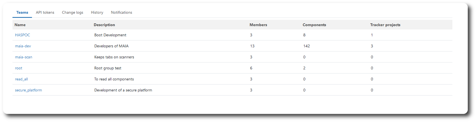 Tracker projects | Number of tracker projects configured for the team. |