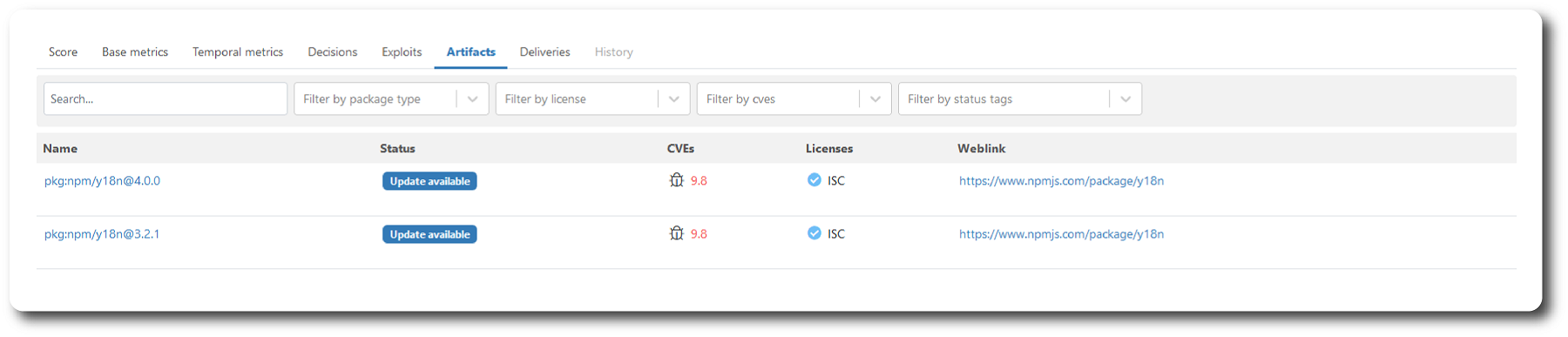 Name | Name and version of the artifact and link to detailed artifact info, in package url format. About package url (external link). |