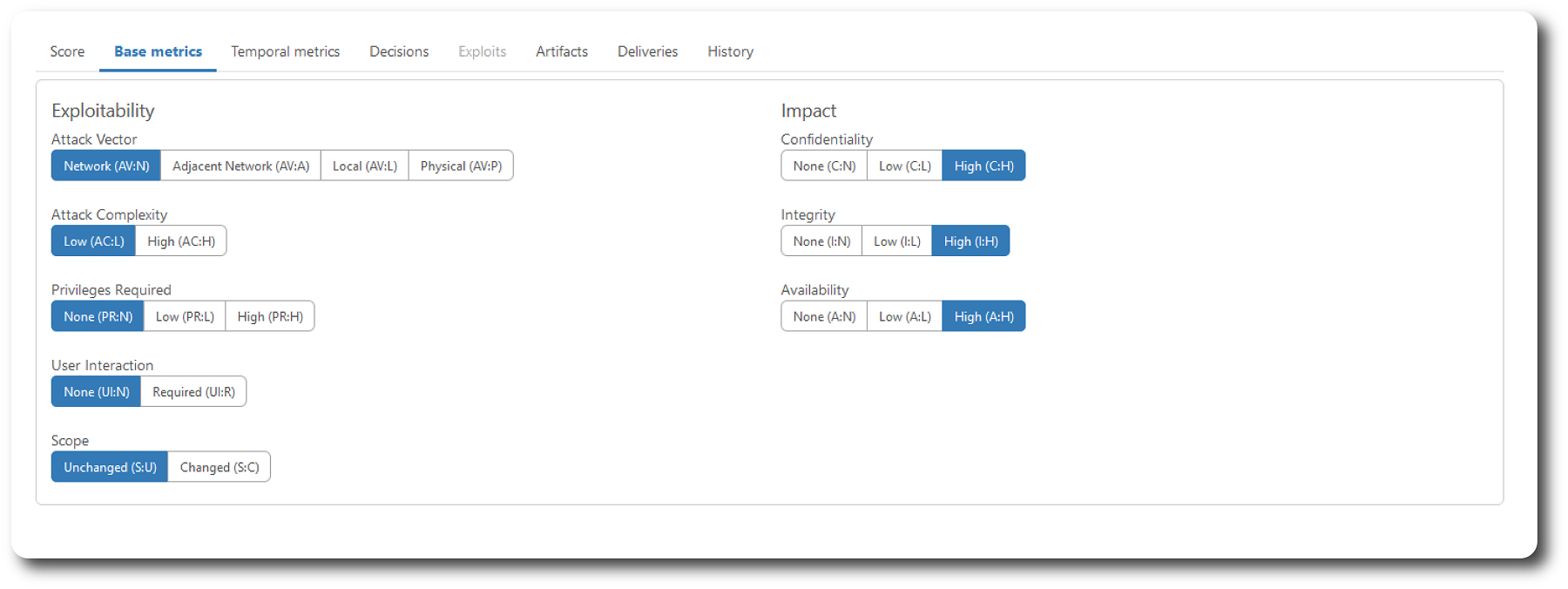 The Base metrics tab contains the Base Score reflecting the severity of a vulnerability according to its intrinsic characteristics which are constant over time and assume the reasonable worst-case impact across different deployed environments.