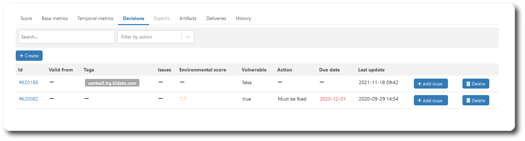 The Decisions tab contains a list of created decisions of how to manage and remediate a vulnerability. The decisions can be targeting specific environments (tags) or all environments.