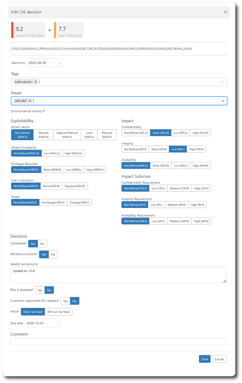 Environmental metrics | Opens an editable selection field, modifying the Environmental metrics. Described in detail here (external link). (optional). |