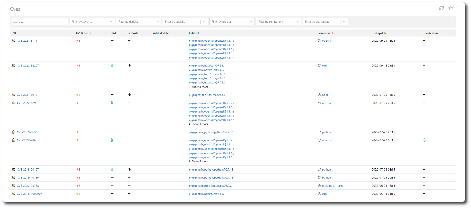The CVEs (Common Vulnerabilities and Exposures) menu page is an index page listing all vulnerabilities identified by MAIA. The information is continuously updated through the CVE Management Service.
