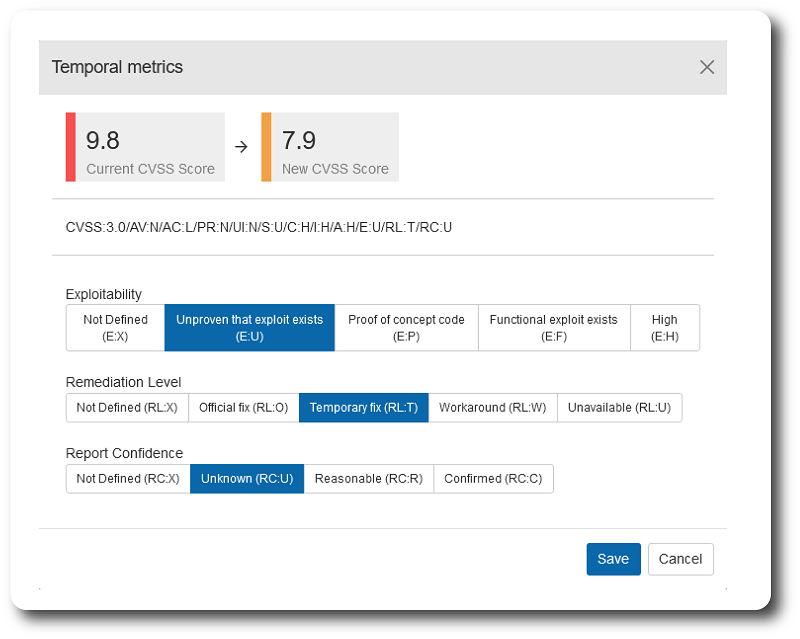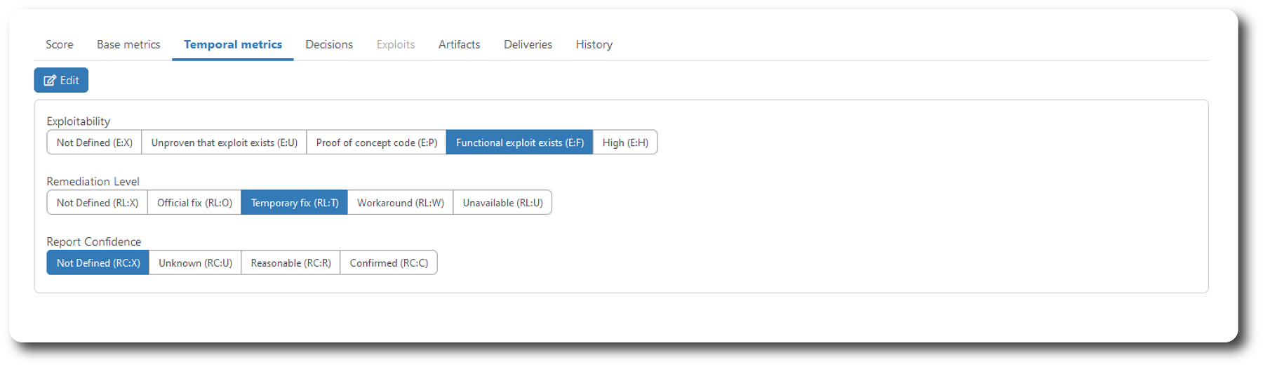 The Temporal metrics tab reflects the characteristics of a vulnerability that change over time. Editing the values will modify the overall scoring.