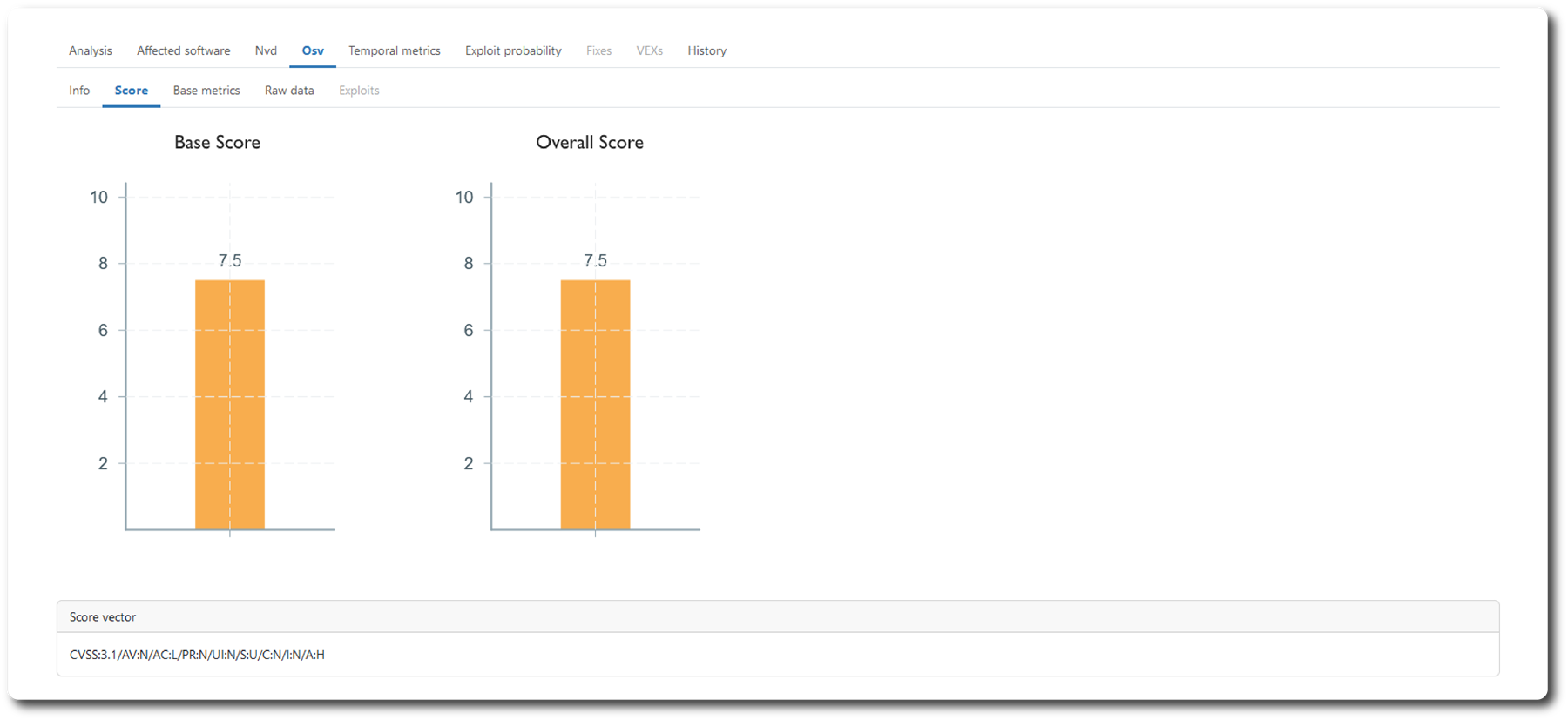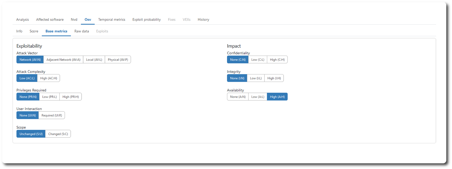 The Base metrics tab contains the Base Score reflecting the severity of a vulnerability according to its intrinsic characteristics which are constant over time and assume the reasonable worst-case impact across different deployed environments.