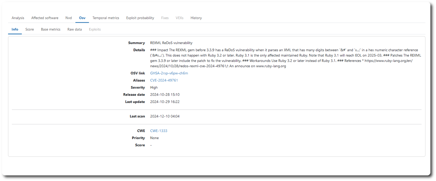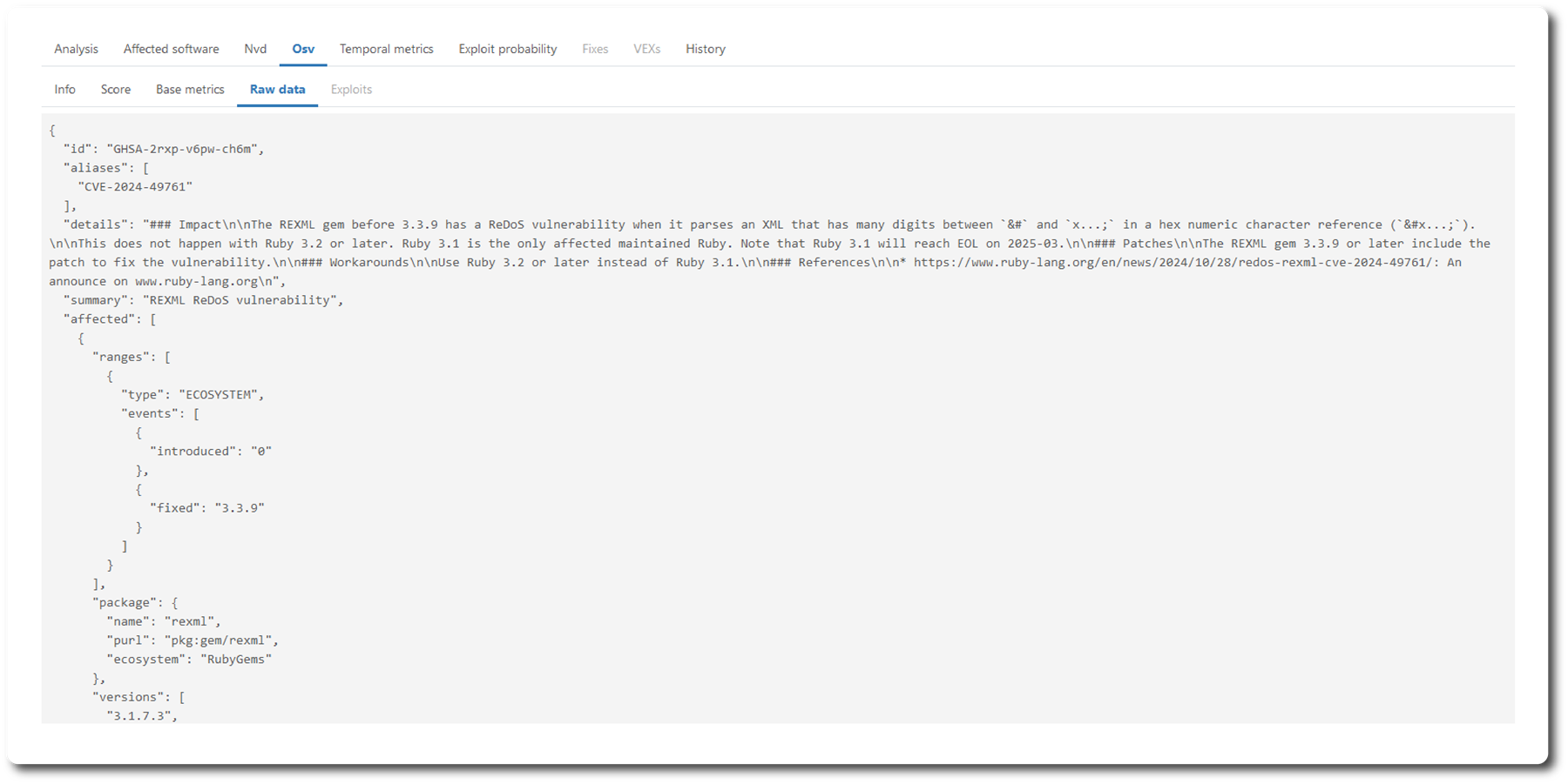 OSV link | OSV identity and link to the vulnerability in OSV. |