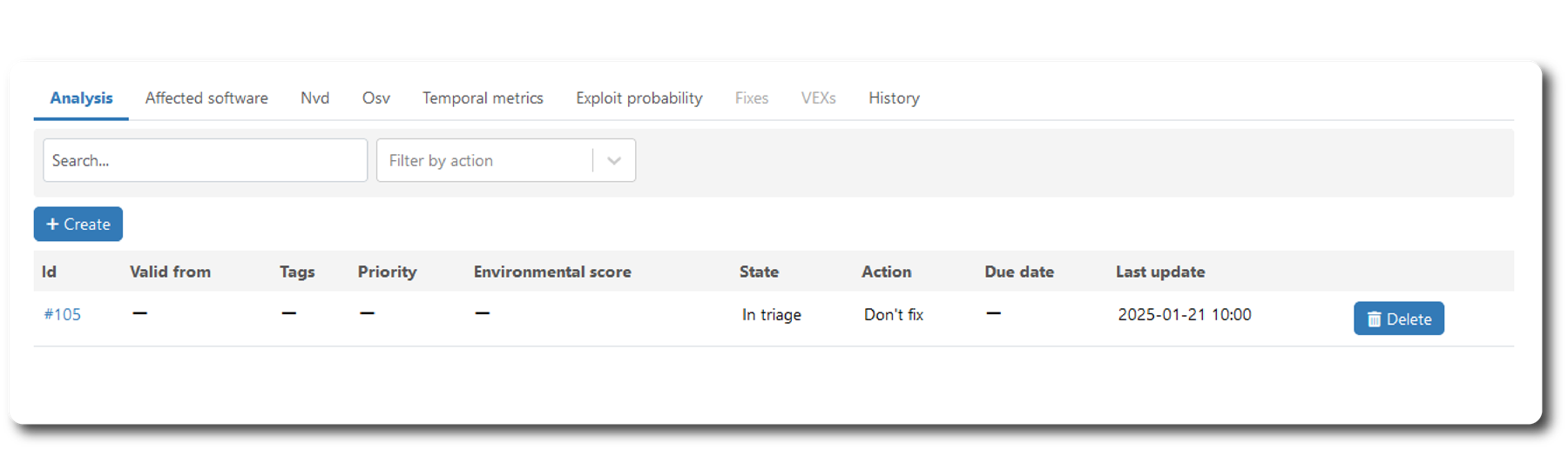 Delivered | Grey=No deliveries where this vulnerability is included, Light blue=Deliveries exists. |