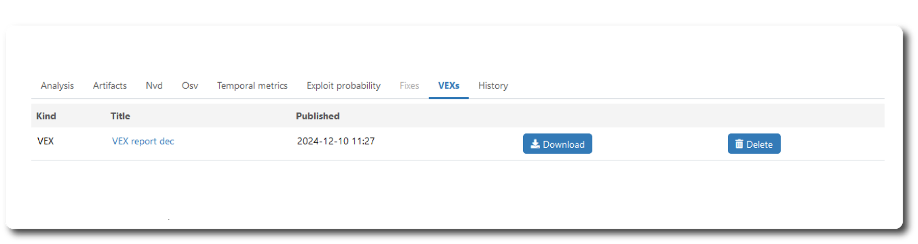 The VEXs tab contains a list of VEX reports generated for current vulnerability.