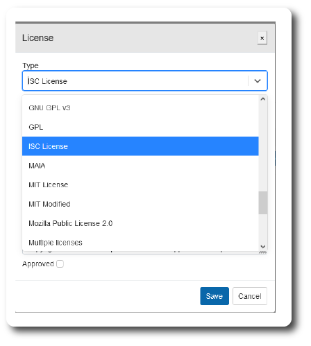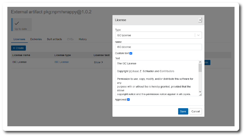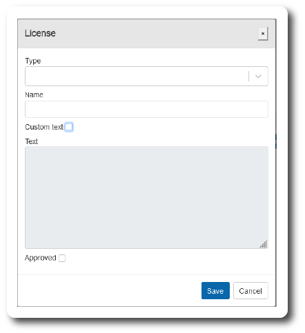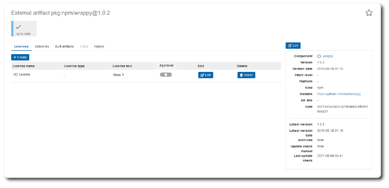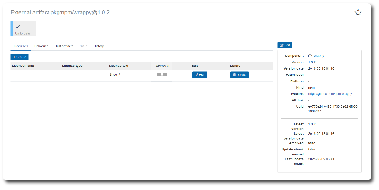 An external artifact (component) registered in MAIA has a Licenses tab. If it doesn't specify a license it's possible to manually add a license.